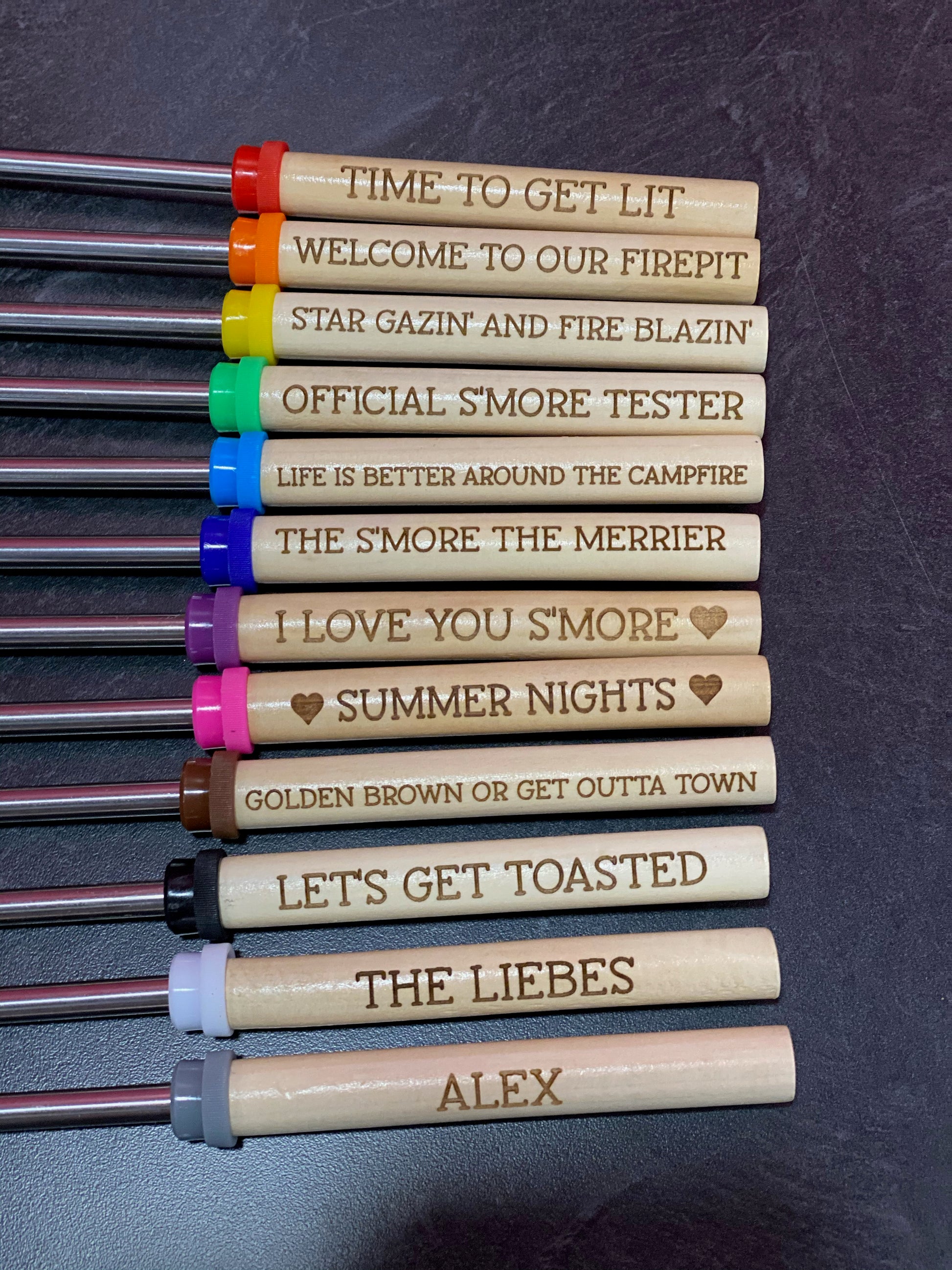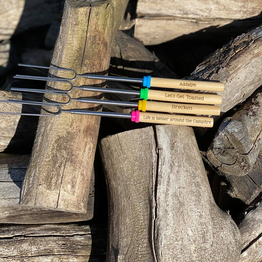 Add names, sayings, or both on these cute and easy to store Marshmallow Roasting Sticks! They extend up to 30" and retract for easy storage.