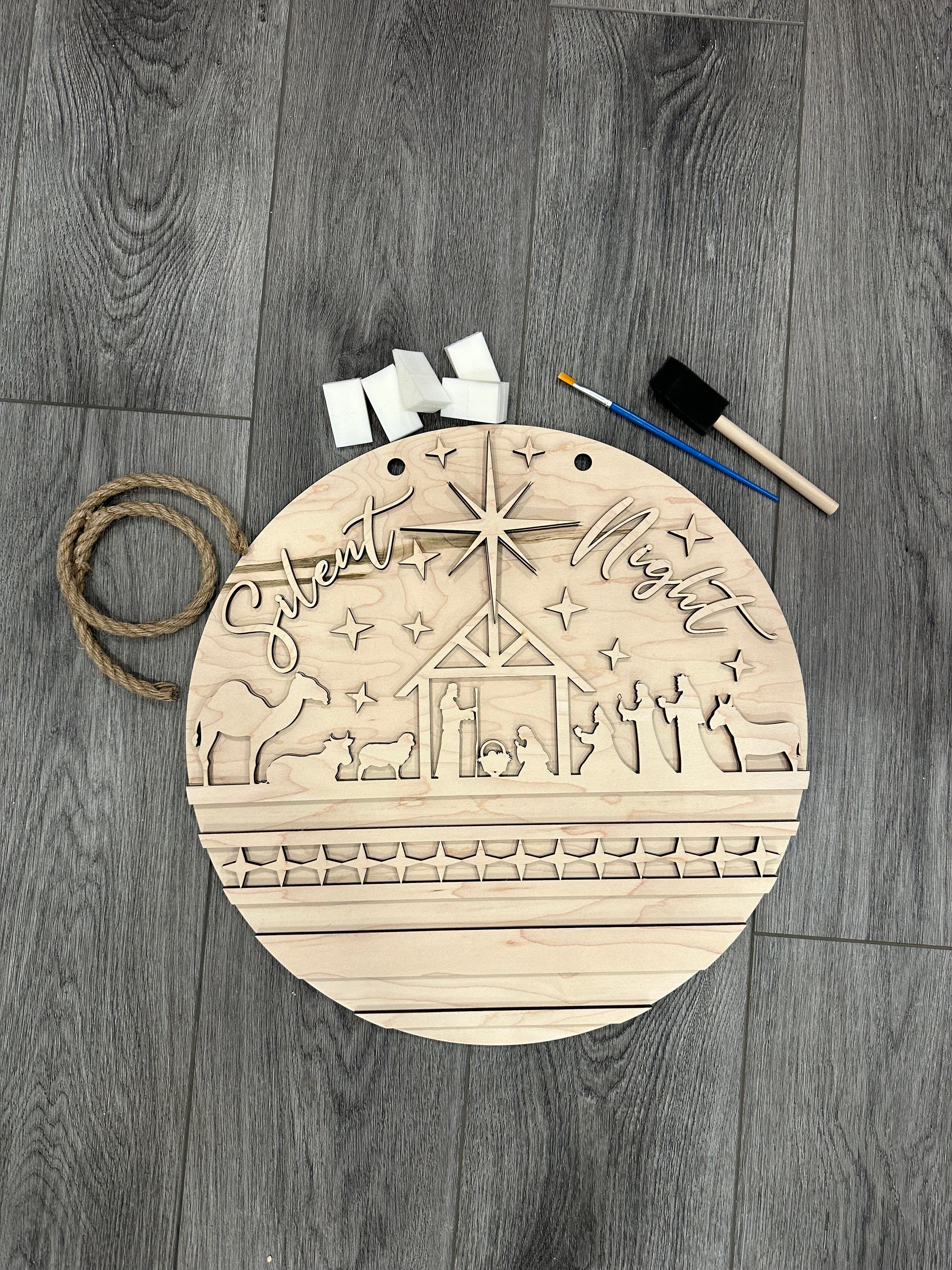 Size of finished sign is 16” in diameter and comes with a rope to hang!
