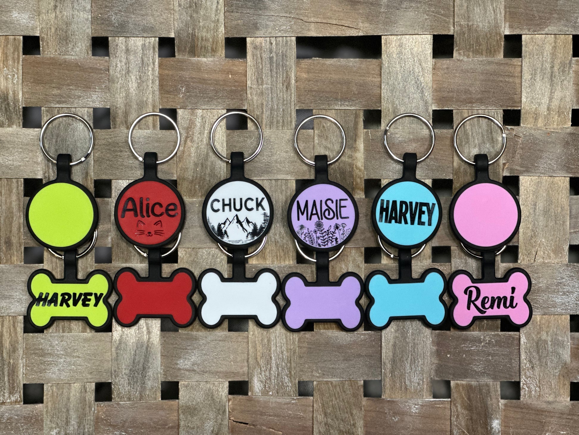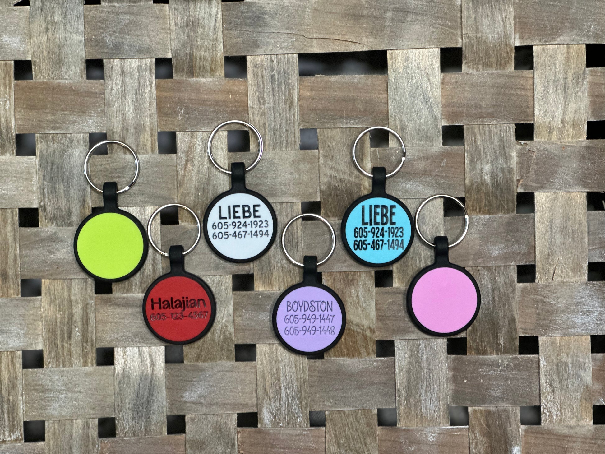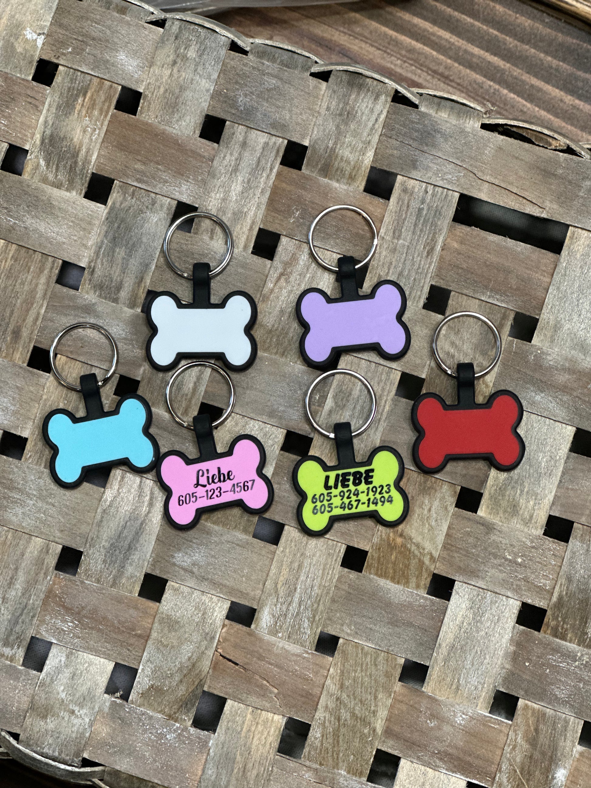These tags are laser engraved into the silicone so they won’t rub off or jingle.